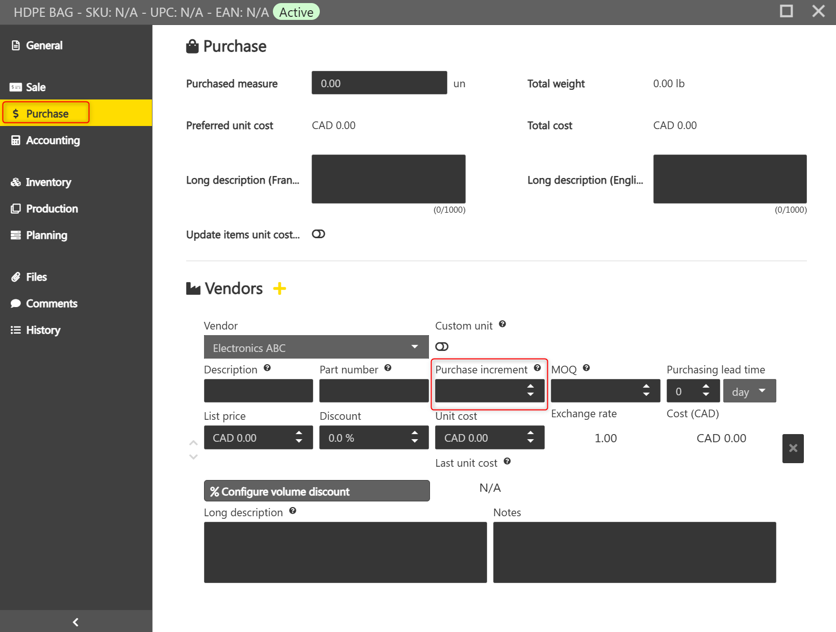 Purchase tab: Purchase increment. With this feature, you can set that the