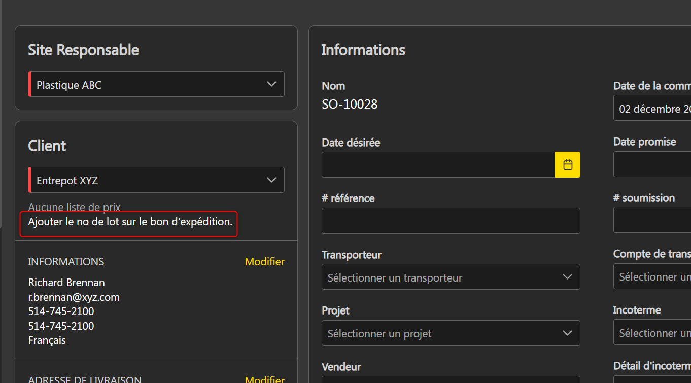 La note client est maintenant présente dans la commande client. Lors de l'association du client à une commande, la note est visible sous le client :