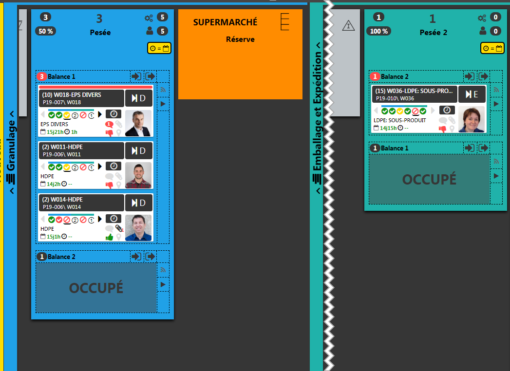 Il est également possible de donner une priorité d’équipement (exemple utiliser la balance 1 après le grannulage, mais la balance 2 à l’expédition) ainsi qu’une limite par équipement à chacune des étapes (dans l’exemple fictif ci-dessous, on peut peser jusqu’à 3 items sur la balance 1 après le grannulage, mais seulement 1 à l’emballage, et la balance 2 n’accepte toujours qu’un seul item).